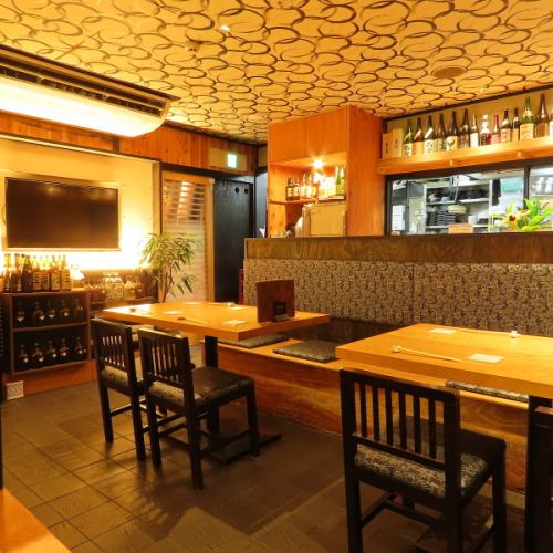 【木の温もりを感じる落ち着いた空間】木目を基調とした店内は、まるで大人の隠れ家のような落ち着いた雰囲気です。都会の喧騒を忘れ、ゆったりと食事を楽しみたい時にぴったりです。和の風情を感じる静かな空間で、心安らぐひとときをお過ごしいただけます。
